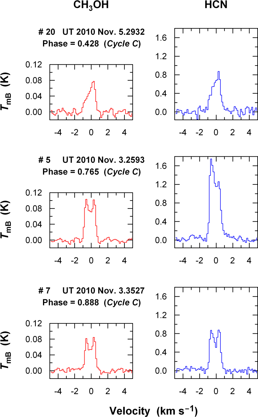 Examples of the line profiles of CH3OH (left panel) and HCN (right panel), illustrating the temporal variation of comet 103P/Hartley 2 as the nucleus rotates (from top to bottom).