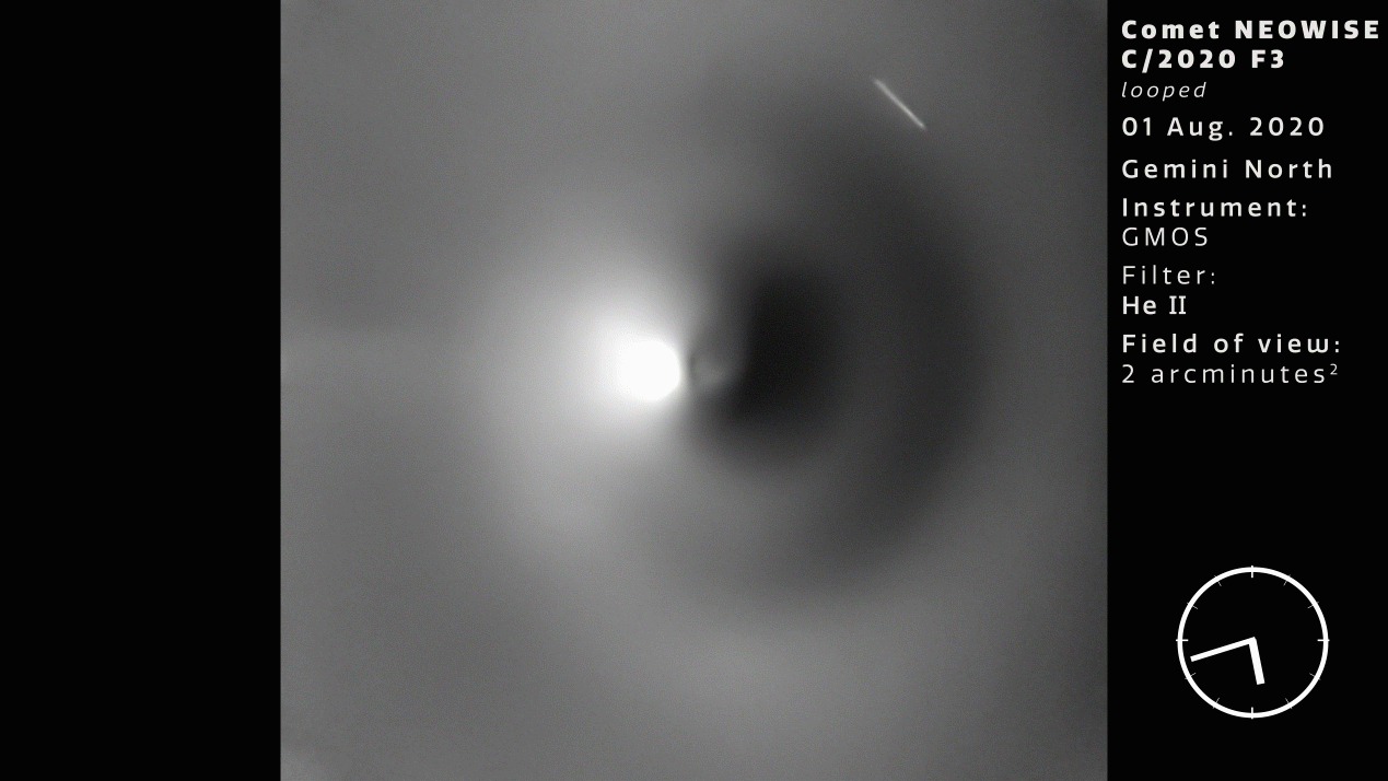 Rotation timelapse animation of Comet NEOWISE obtained with Gemini North on Hawaii's Maunakea on the night of 1 August 2020. This sequence was obtained using the Gemini Multi-Object Spectrograph (GMOS) with the 468/8 nm filter and digitally enhanced using a dedicated algorithm. The field of view is 2 arcminutes across.
