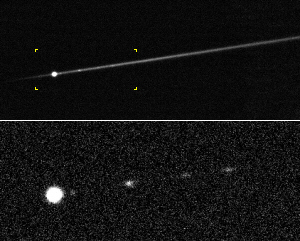 Active asteroid P/2012 F5 captured by Keck II/DEIMOS in mid-2014. Top panel shows a wide-angle view of the main nucleus and smaller fragments (indicated by arrows when you move a mouse cursor over the image) embedded in a long dust trail. Bottom panel shows a close-up view with the trail numerically removed to enhance the visibility of the fragments.