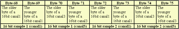 The last two bytes 0xCE33 = 52787 this is a counter of samples during 300 seconds. It means, a frequency of sampling is 52787 / 300 = 175.95 sample/sec simultaneously in both canals (ELA7 receiver only). |